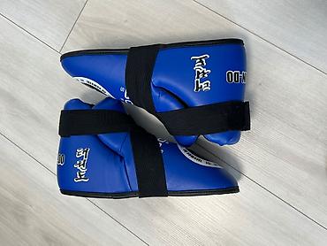 Матеріали: зносостійка штучна шкіра, м’який багатошаровий наповнювач, еластичні ремені та липучки для надійної фіксації. Підійде для тренувань і спарингів у секціях таеквондо ITF, карате, кікбоксингу чи ММА. Колір усіх елементів — синій (окрім ракушки — біла).